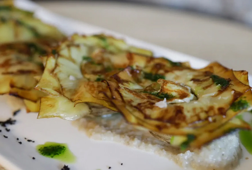 - Taco de bacalao confitado, crema de tomate y albahaca