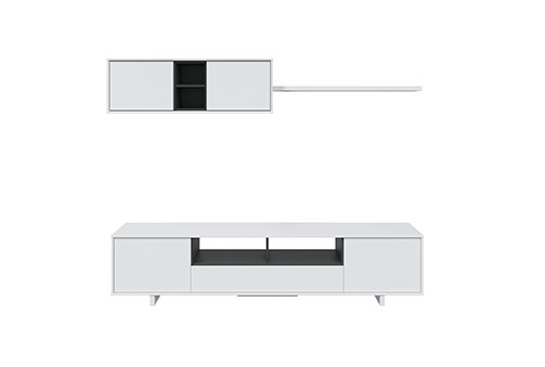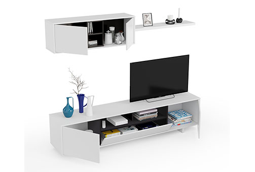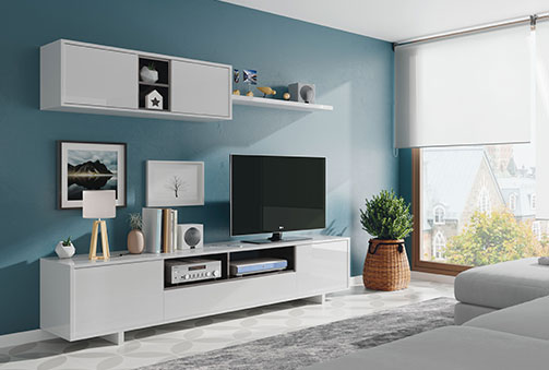 Conjunto para salón compuesto de un mueble de televisión con 3 puertas, un módulo superior de 2 puertas y un estante de colgar.
